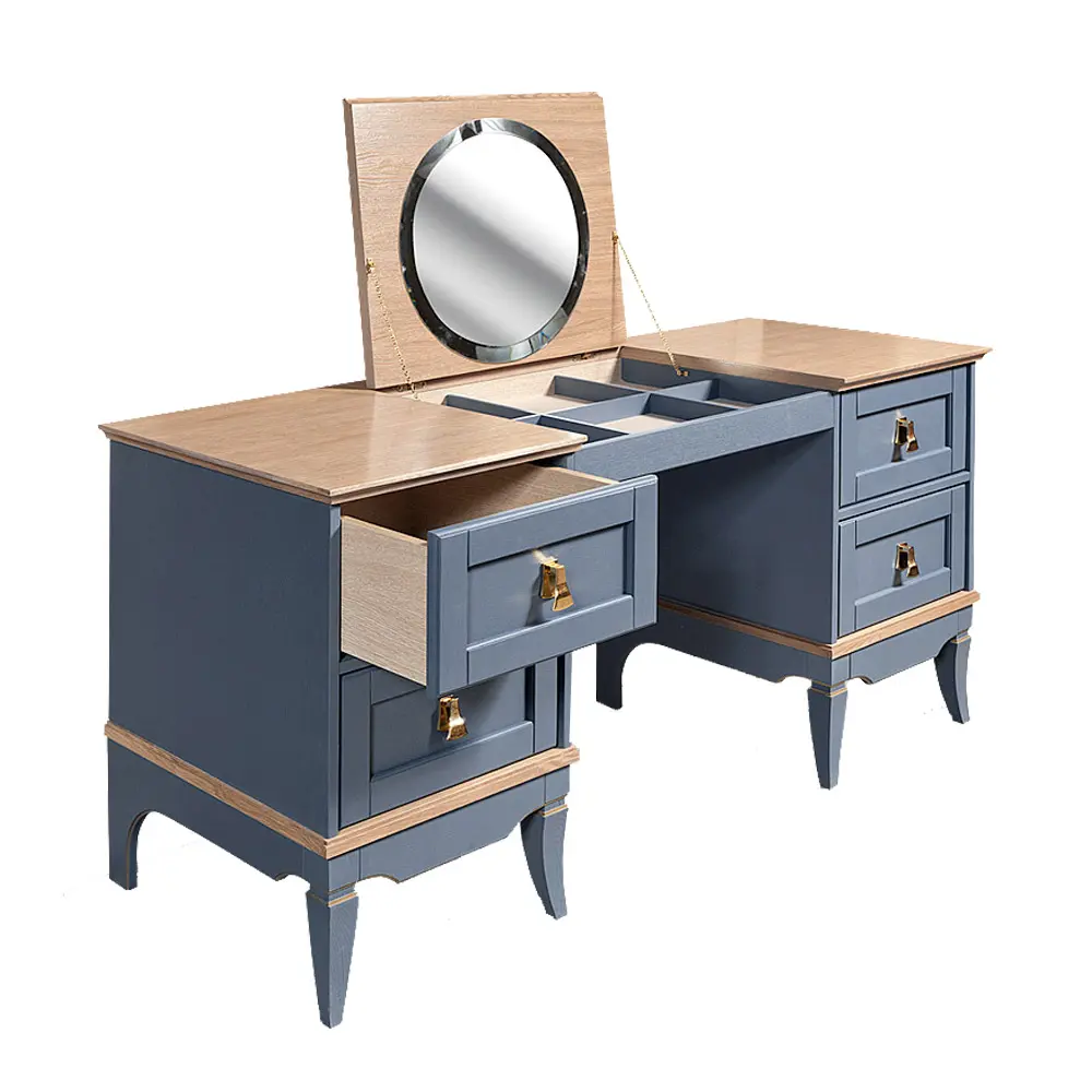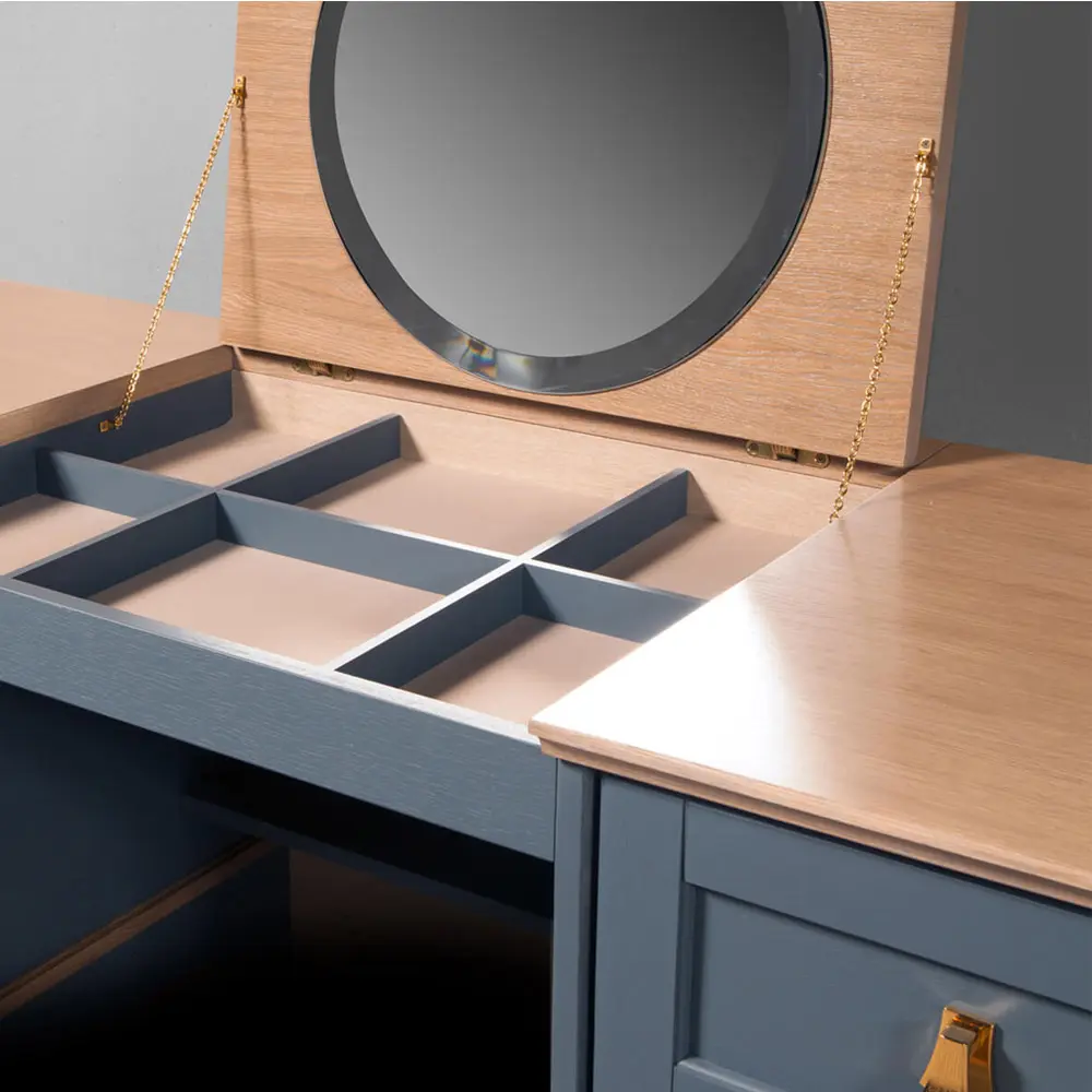 Наполнение стола включает откидное зеркало, органайзер для косметики и/или украшений, 4 ящика и высокие изящные ножки. Это позволяет удобно хранить все необходимые предметы и аксессуары.