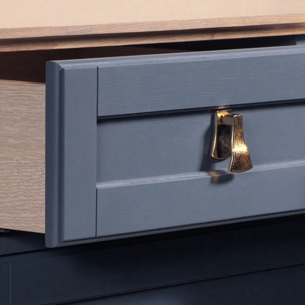 Столешница и фасады стола выполнены из массива клеёного дуба, который отличается прочностью и долговечностью. Каркас изготовлен из клеёной древесины (дуб) и МДФ, облицованного шпоном (дуб). Опоры, обкладка и накладки также выполнены из массива, что придаёт столу дополнительную прочность и устойчивость.