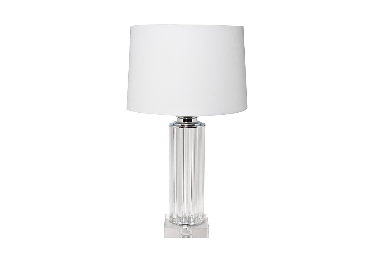 - Материал: Основание - металл никелированный цвет хром, ножка стеклянная; плафон - ткань светло-серого цвета