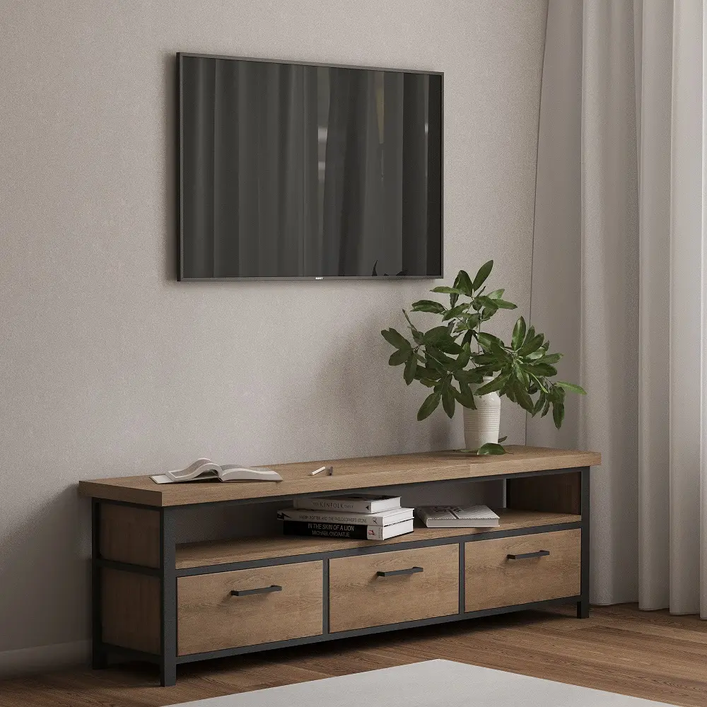 Тумба под ТВ с тремя выдвижными ящиками в стиле ЛОФТ 10-03. Каркас выполнен из металлического профиля и окрашен в черный цвет. Деревянные элементы выполнены из массива сосны. На заказ, возможно изготовление всех деревянных элементов-из массива ясеня, дуба или бука, покрытые маслом, бесцветным лаком или эмалями. А металлический каркас изделия может быть выкрашен в любой цвет по RAL. Подробности и более точную цену можно узнать у наших консультантов.