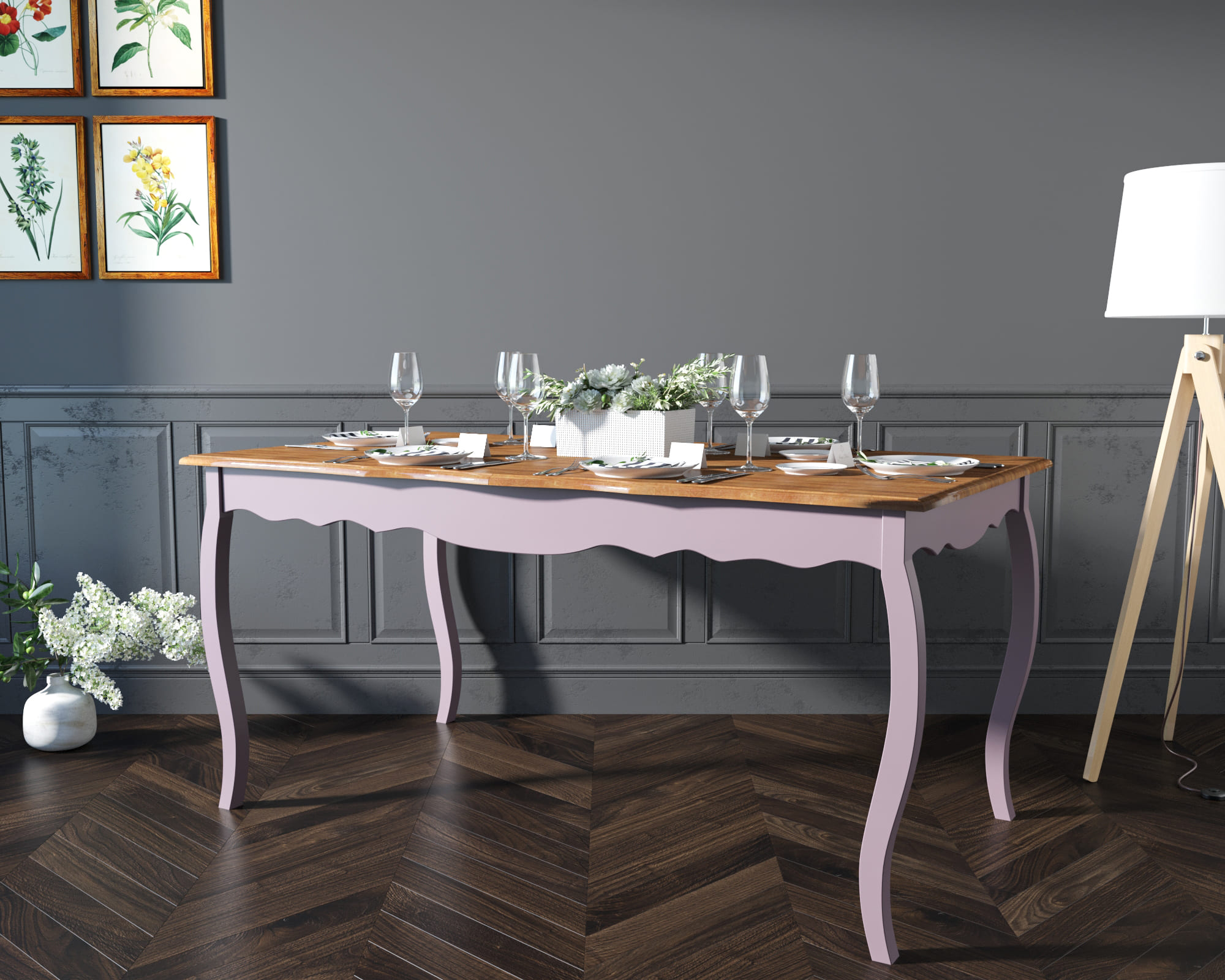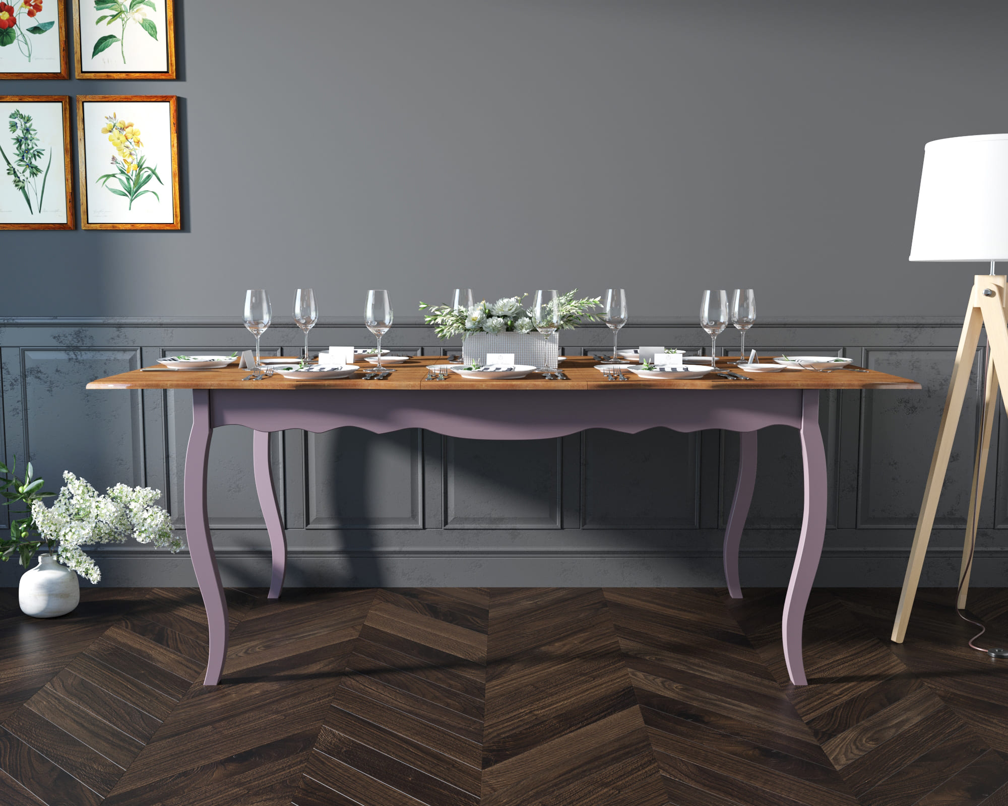 расширения обеденной зоны с160 на 200 см, что удается при помощи дополнительной вставной панели из массива ясеня. Загадочный лавандовый цвет, патина (по желанию),