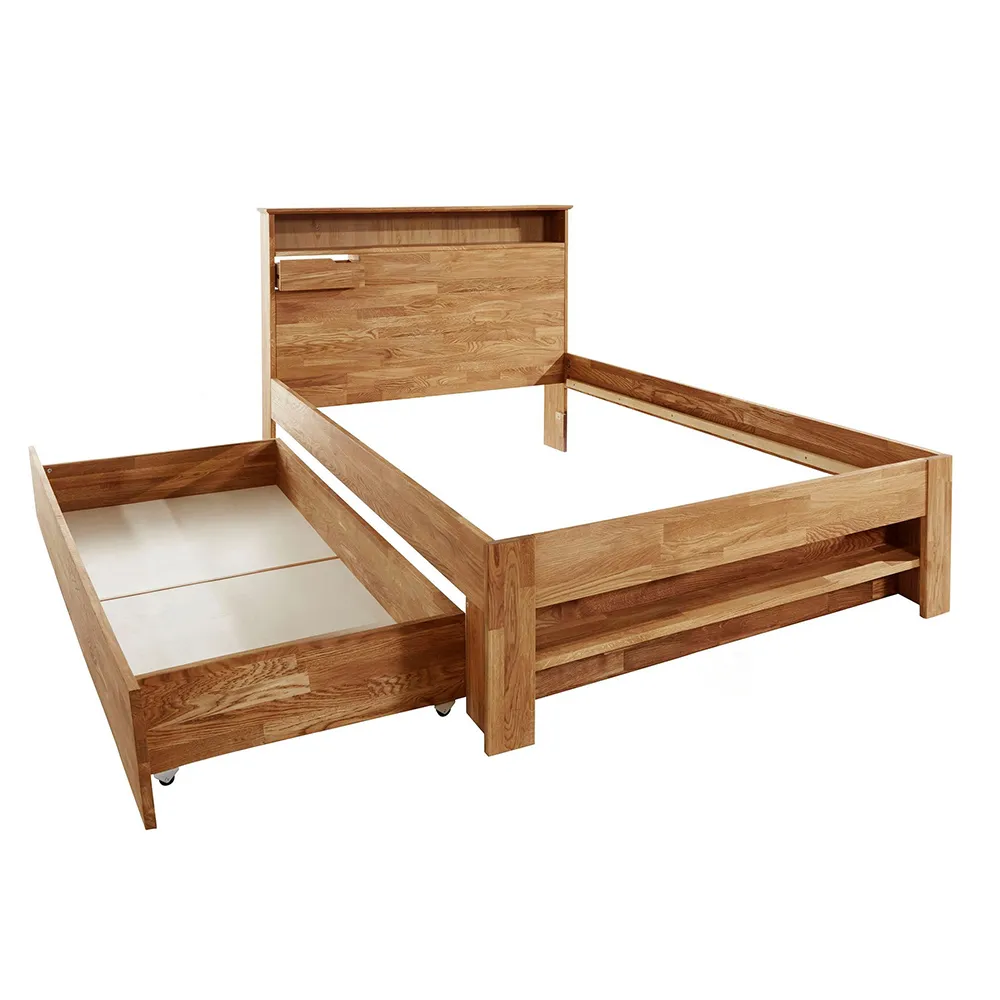 В изголовье и в изножье кровати есть широкие встроенные полки, в изголовье также сделаны маленькие выдвижные ящики для мелочей с каждой стороны. Кроме этого, кровать комплектуется двумя выкатными ящиками для хранения одежды и постельного белья.